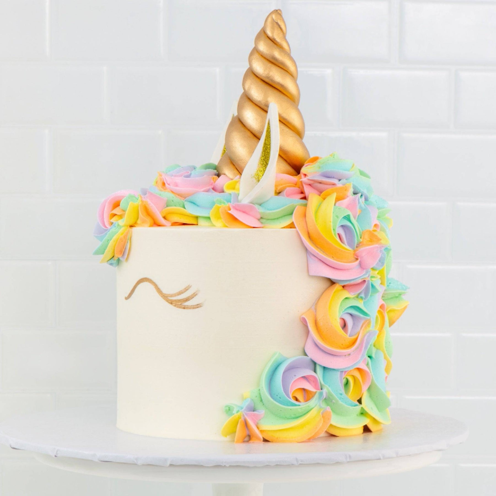 Choose from any of our decadent cake flavors so this cake is truly made for you. Frosted in smooth vanilla buttercream frosting, rainbow frosting rosettes, sugar ears, and a gold horn. Sprinkled with magical glitter for the final touch!